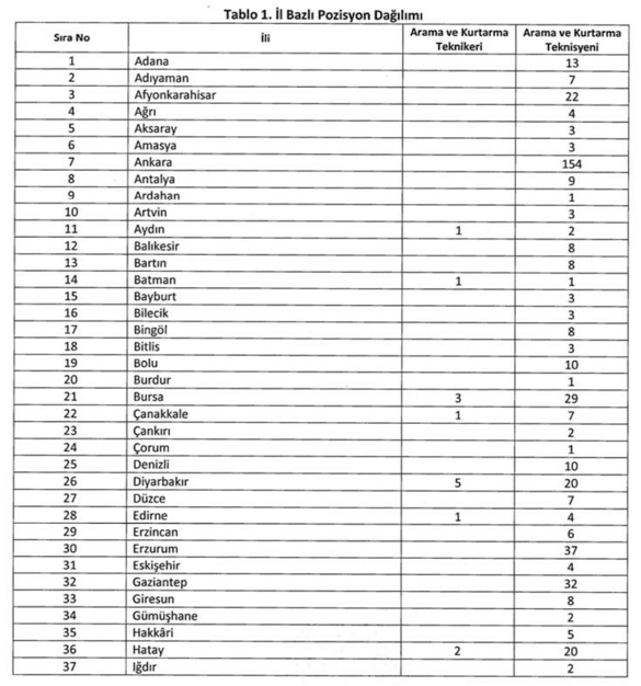 15 Temmuz 2018 tarihinde yayınlanan 4 Nolu Cumhurbaşkanlığı Kararnamesi ile İçişleri Bakanlığına bağlanan Afet ve Acil Durum Yönetimi Başkanlığı, istihdam edilmek üzere toplam 1.250 sözleşmeli personel alımı yapacak. Bunlardan 77'si sözleşmeli arama ve kurtarma teknikeri kalan 1.173 kişi ise sözleşmeli arama ve kurtarma teknisyeni olarak görevlendirilecek.