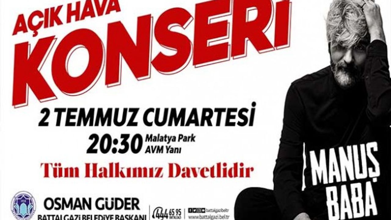 Battalgazi Belediyesi yaz ayının gelmesiyle birlikte, direk halka dokunan sosyal içerikli çalışmalarına hızını arttırarak devam ediyor. Kültür ve Sosyal İşler Müdürlüğü tarafından kültürel etkinlikler kapsamında düzenlenecek olan açık hava konseri ile milyonlarca müzik severin kalplerinde taht kurmuş ünlü sanatçı Manuş Baba, Battalgazililerle buluşacak. 2 Temmuz Cumartesi günü saat: 20.30’da Malatya Park AVM Yanı Konser alanındaki konserde sahne alacak olan ünlü sanatçı Manuş Baba, seslendireceği parçalarla müzik severlere unutulmaz anlar yaşatacak.