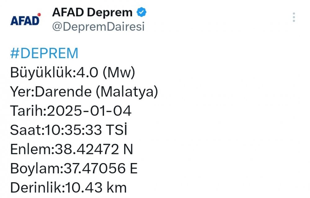 Türkiye'nin dört bir yanından deprem haberleri peş peşe geliyor. Kandilli Rasathanesi'nden alınan verilere göre Malatya'da saat 10.35 sıralarında bir deprem meydana geldi.