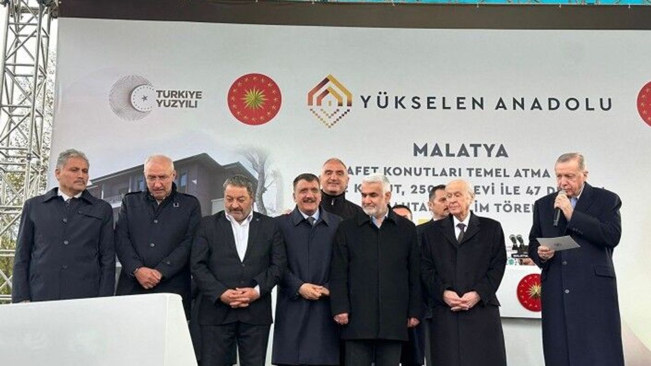 Cumhurbaşkanı Recep Tayyip Erdoğan, beraberinde Cumhur İttifakı üyeleri Milliyetçi Hareket Partisi Genel Başkanı Devlet Bahçeli, Büyük Birlik Partisi Genel Başkanı Mustafa Destici, Hüda-Par Genel Başkanı Zekeriya Yapıcı, DSP Genel Başkanı Önder Aksakal ile birlikte Malatya'da 6 bin 700 konutun temeli ile 442 konut, 250 köy evi ve 47 dükkanın anahtar teslim törenine katıldı.