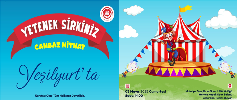 Yeşilyurt Belediyesi, ‘2025 Aile Yılı’ etkinlikleri kapsamında çocuklara ve ailelere yönelik renkli bir gösteriye daha ev sahipliği yapacak. Türkiye’nin sevilen sahne sanatçıları arasında yer alan Cambaz Mithat, "Yetenek Sirkiniz" adlı gösterisiyle çocuklar ve gençlerle buluşmaya hazırlanıyor.
