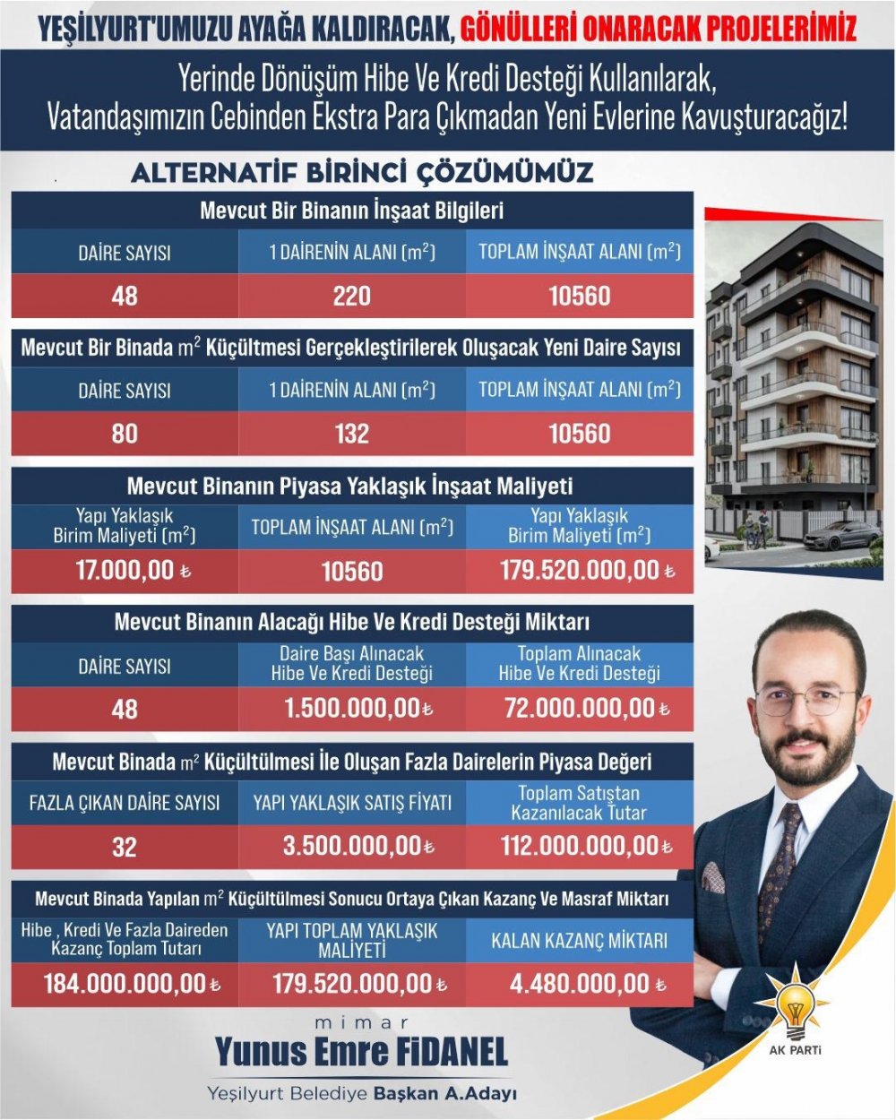 Vatandaşımızın cebinden ekstra para çıkmadan yeni evlerine kavuşturacaklarını belirten Mimar Fidanel, mevcut bir binanın inşaat bilgileri üzerinden yaptığı projede daire sayısı 48 olan bir bina için 220 metrekarelik alanın toplam inşaat alanının 10560 metrekare olduğunu 1.5 milyon TL hibe ve kredi desteği sağlandığını toplamda ise 72 milyon TL tutarında hibe ve kredi kullanılabileceğini belirtti.