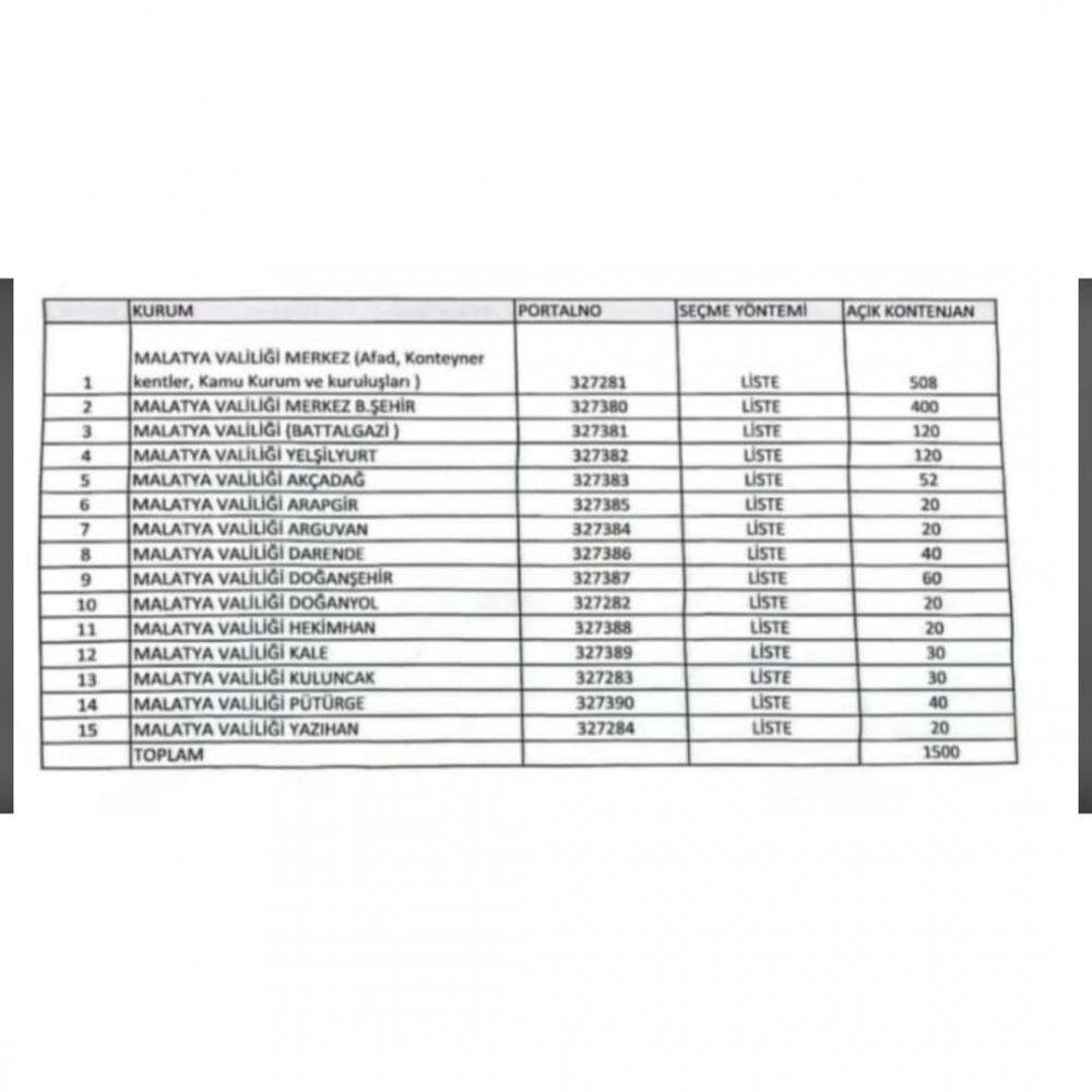MALATYA VALİLİĞİ İLE İŞBİRLİĞİ KAPSAMINDA 1500 KİŞİLİK TYP BAŞVURULARINA İLİŞKİN OLARAK. İLGİLİ TABLO EKTEDİR.