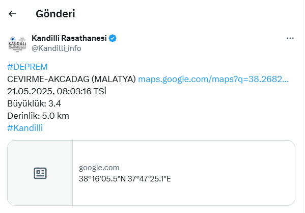 Malatya'da sabah saat 08.03 sıralarında bir deprem meydana geldi.Depremin büyüklüğü 3.4 olarak duyuruldu. Depremin derinliği ise 5.0 km olarak ölçüldü. Deprem sonrası herhangi bir hasar bildirimi gelmedi.