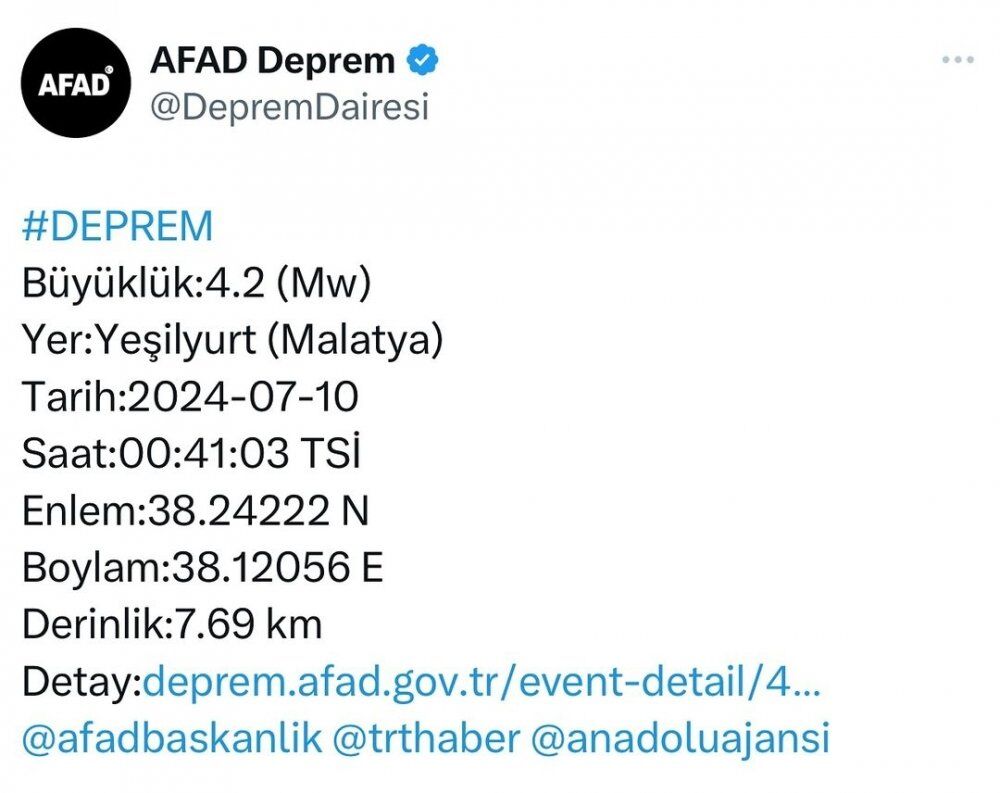 AFAD, Malatya'da merkez üssü Yeşilyurt olan 4,2 büyüklüğünde deprem meydana geldiğini duyurdu.
