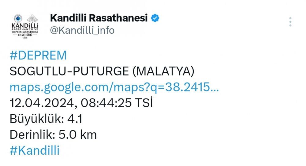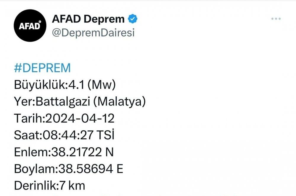 Malatya ‘da; Afad verilerine göre merkez üstü Battalgazi’de 4.1 büyüklüğünde deprem, Kandilli Rasathanesi verilerine göre ise merkez üstü Pütürge’de 4.1 büyüklüğünde deprem meydana geldi