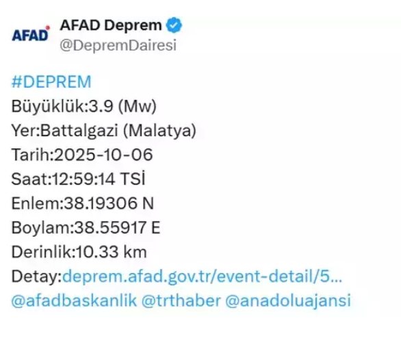 Afet ve Acil Durum Yönetimi Başkanlığının (AFAD) internet sitesinde yer alan bilgiye göre, saat 12:59'da merkez üssü Battalgazi ilçesi olan 3.9 büyüklüğünde sarsıntı kaydedildi.