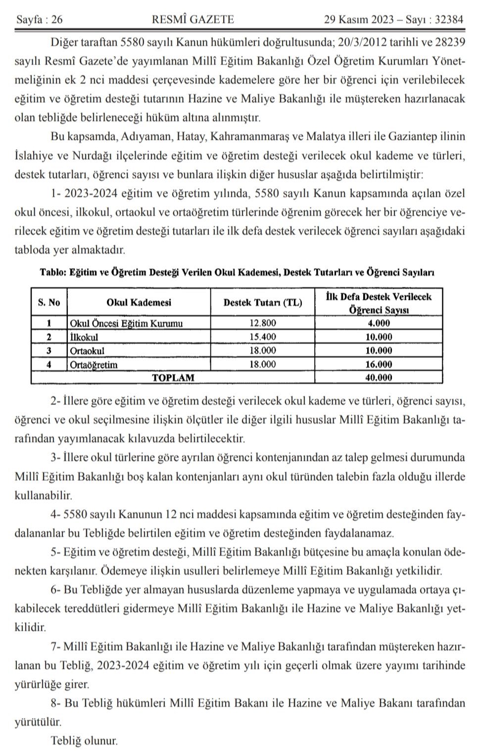 Milli Eğitim Bakanlığı ile Hazine ve Maliye Bakanlığı tarafından, 2023-2024 Eğitim ve Öğretim yılında Malatya’daki özel okullarda öğrenim gören/görecek öğrenciler için eğitim ve öğretim desteği verilmesine ilişkin tebliğ Resmi Gazetede yayımlanarak yürürlüğe girdi.
