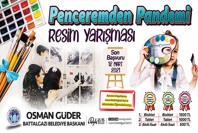 Battalgazi Belediyesi’ne bağlı Kültür ve Sosyal İşler Müdürlüğü, içerisinde bulunduğumuz koronavirüs süreciyle birlikte insanların değişen yaşam tarzlarını, alışkanlıklarını, sınırlanan sosyal çevrelerindeki bakış açılarını ve iletişim biçimlerini görsel sanatlar yoluyla ifade edebilmelerine destek olmak amacıyla, 3 kategoride “Penceremden Pandemi” konulu resim yarışması düzenlenecek. Ortaokul, Lise ve Yetişkinler kategorisinde düzenlenecek olan resim yarışmasının başvuruları 5 Şubat 2021 tarihinde başlarken, 12 Mart 2021 tarihinde ise başvurular son bulacak. 18 yaş üzeri tüm sanatseverlerin de katılımına açık olacak olan yarışmaya, resmi ve özel okullarda eğitim gören ilkokul, ortaokul ve lise öğrencileri de ücretsiz olarak başvuru yapabilecek. Yarışmaya katılanların seçtikleri bir tema üzerinden yaptıkları resimleri belirtilen tarihler arasında Battalgazi Belediyesi Kültür ve Sosyal İşler Müdürlüğü’ne başvuru formu ile birlikte bir adet eserlerini elden veya kargo ile teslim edebilecek. Resim yarışmasının ödül töreni ise 22 Mart tarihinde gerçekleştirilecek.