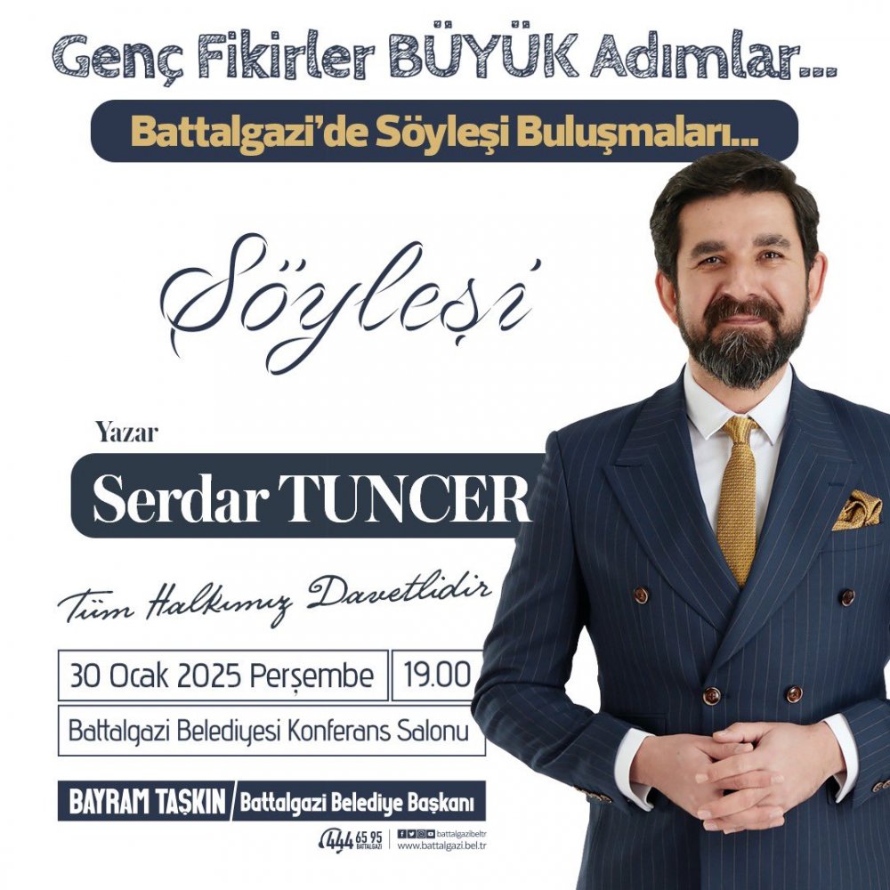 Battalgazi Belediyesi Gençlik ve Spor Hizmetleri Müdürlüğü tarafından düzenlenen ‘Genç Fikirler Büyük Adımlar Battalgazi’de Söyleşi Buluşmaları’ etkinlikleri kapsamında, Şair Yazar ve televizyon programcısı Serdar Tuncer, Malatyalılarla bir araya geliyor.