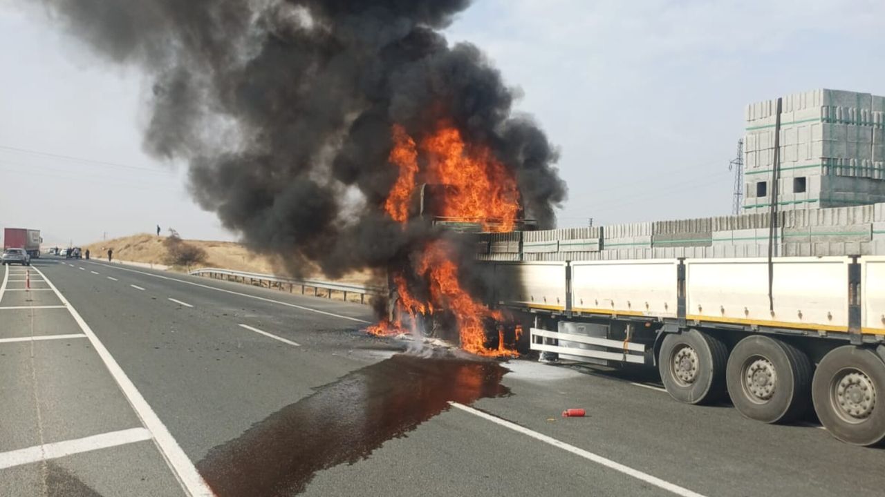 Malatya-Elazığ Karayolu üzerinde seyir halindeyken alev alan bir tırda büyük çapta yangın çıktı. Kısa sürede büyüyen yangında inşaat malzemesi taşıyan tırın ön kupa kısmı tamamen yanarken, olay anı diğer sürücülerin cep telefonu kameralarına yansıdı.